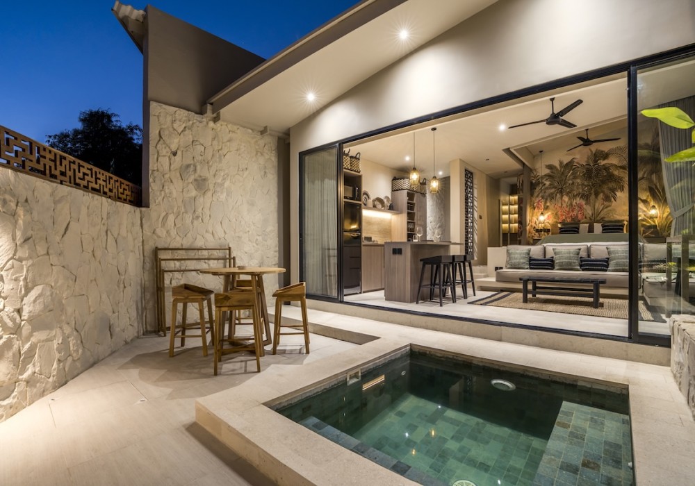 Outdoors, a small alfresco dining area and seating provide a relaxed spot to enjoy morning coffee or evening drinks. Surrounded by natural stone walls and greenery, it’s a peaceful corner to relax.