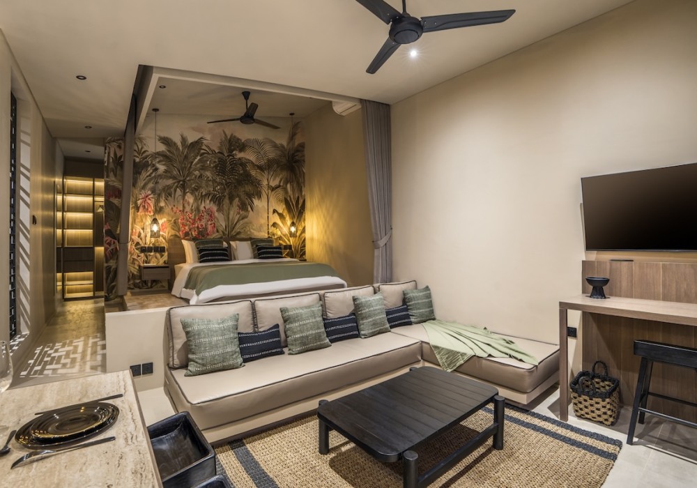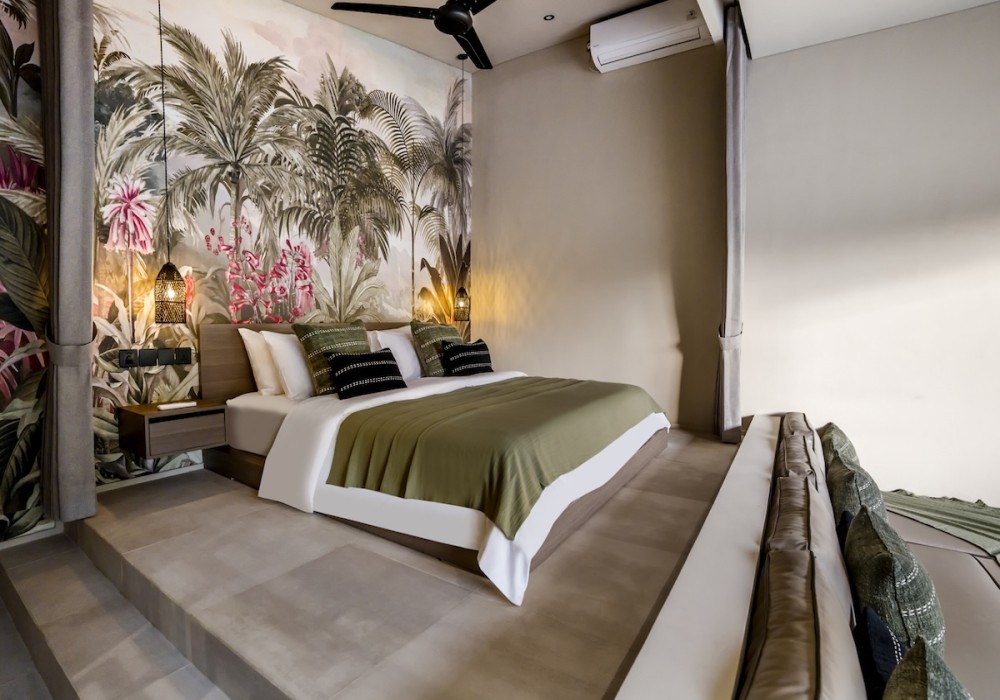 The bedroom sits on a raised platform and features a king-sized bed, soft linens, and a hand-painted tropical mural that brings a touch of nature indoors. Floor-to-ceiling curtains create the option of waking up to morning sunshine or enjoying a slower, shaded start to the day.