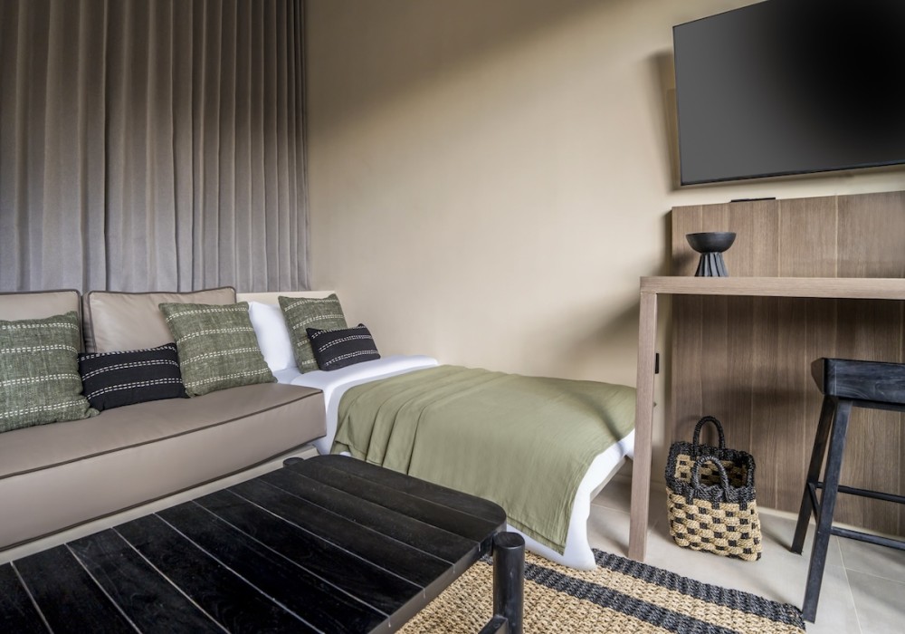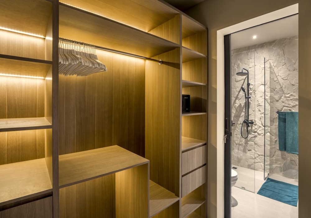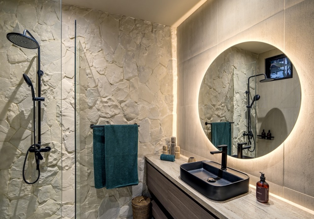 The en-suite bathroom has a spa-like feel, with stone-textured walls, a walk-in rain shower, and sleek black fittings. It’s designed for both function and comfort, the perfect place to refresh after the beach.